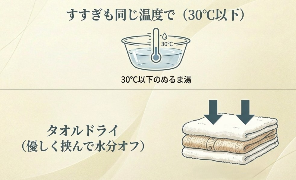 このとき、水の温度を一定に保つことが非常に重要です。洗いはぬるま湯なのに、すすぎを冷たい水で行うと、温度変化によって繊維が急激に収縮し、縮みの原因になってしまいます。